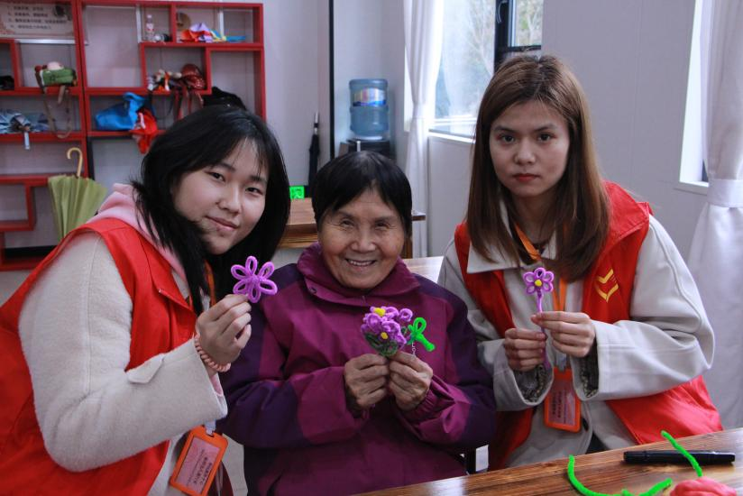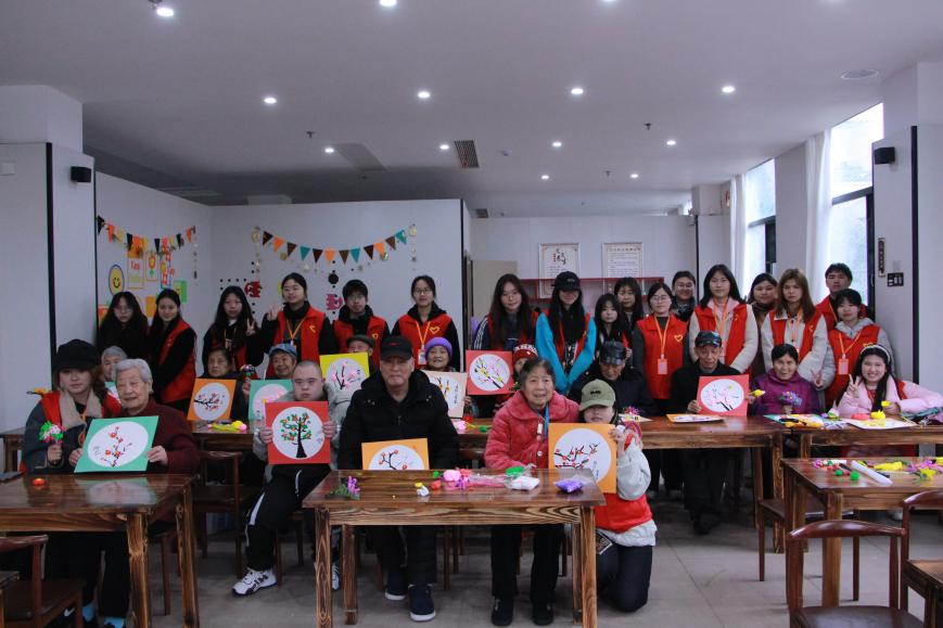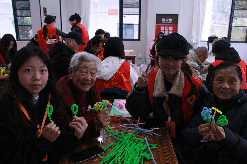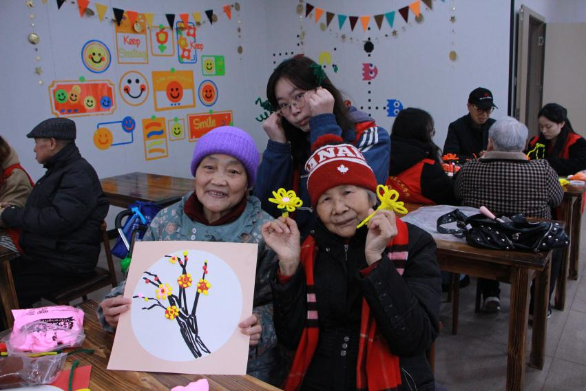 手工制作环节,志愿者们与老人们携手合作,用扭扭棒制作出各式花朵,用多彩黏土塑造出生动的梅花与蜜蜂。在创作过程中,大家彼此交流,互相协助,充分发挥各自想象力和创造力,一件件精致的手工作品不仅展现了老人们的巧手匠心,也寄托了志愿者与老人们间的深情厚谊。